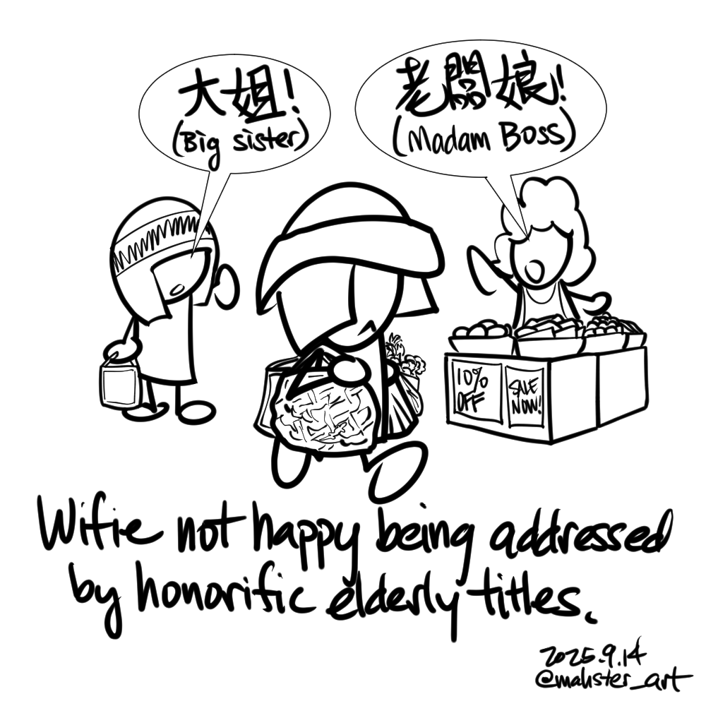 September 14, 2025September 14, 2025 Big Sister Wifie not happy being addressed by honorific elderly titles. 老婆不爽被叫『大姐』及『老闆娘』。 mahster_art #adventureswithwifie #wheresgecko #gettingold